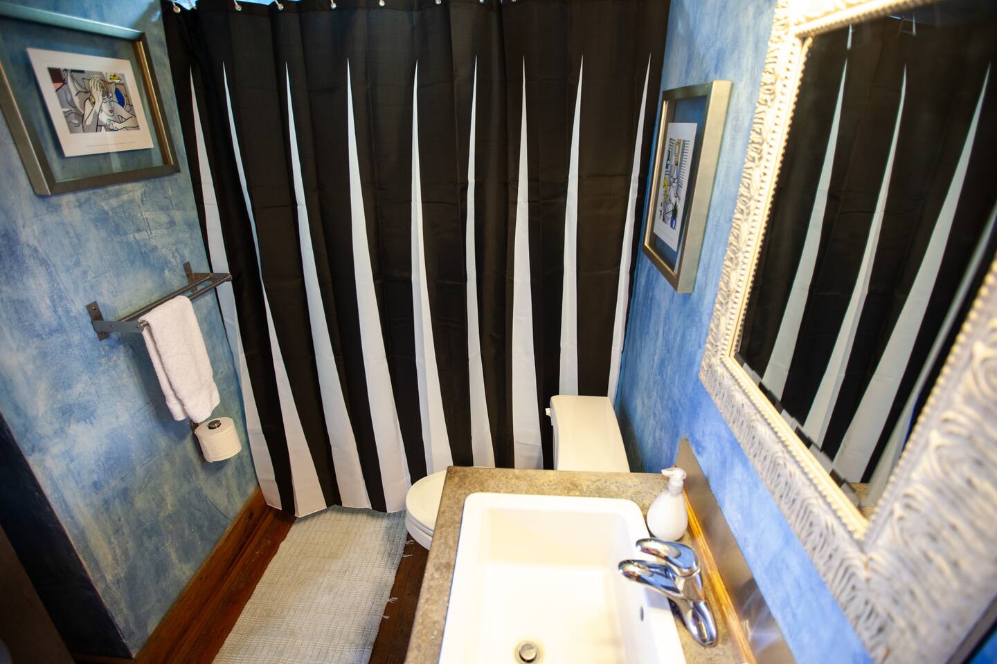 Great open floor plan. Kitchen is wide open and has plenty of room to spread out if you wish to cook a meal. Kitchen bar doubles as a solid workspace. Coffee, a couple of a snacks, and a few beers will be there for your arrival. Kitchen opens up into the living room where you will have a comfortable sitting area for hanging out. There is a TV with an Apple TV hooked up which has content from Netflix, Hulu, ESPN, etc. As well as a massive collection of iTunes Movies. The bedroom has a queen bed and is up a few steps on a platform that has a sliding door for a bit of privacy. Small closet to hang your clothes and a few shelves to place your folded items. The two bedside lamps have built in USB ports for easy device charging. The Bathroom has a full shower tub duo. Shampoo/Conditioner, soap and towels are provided. You will also find the washer in dryer in the bathroom closet. OnSite parking is not available.